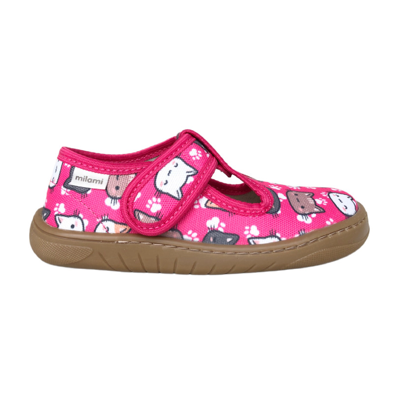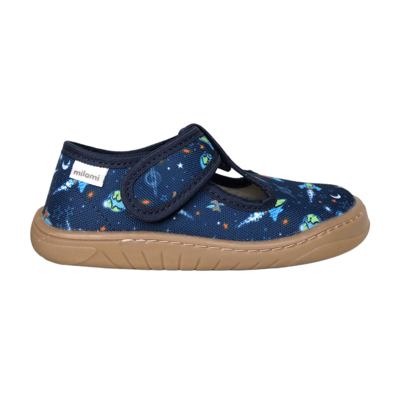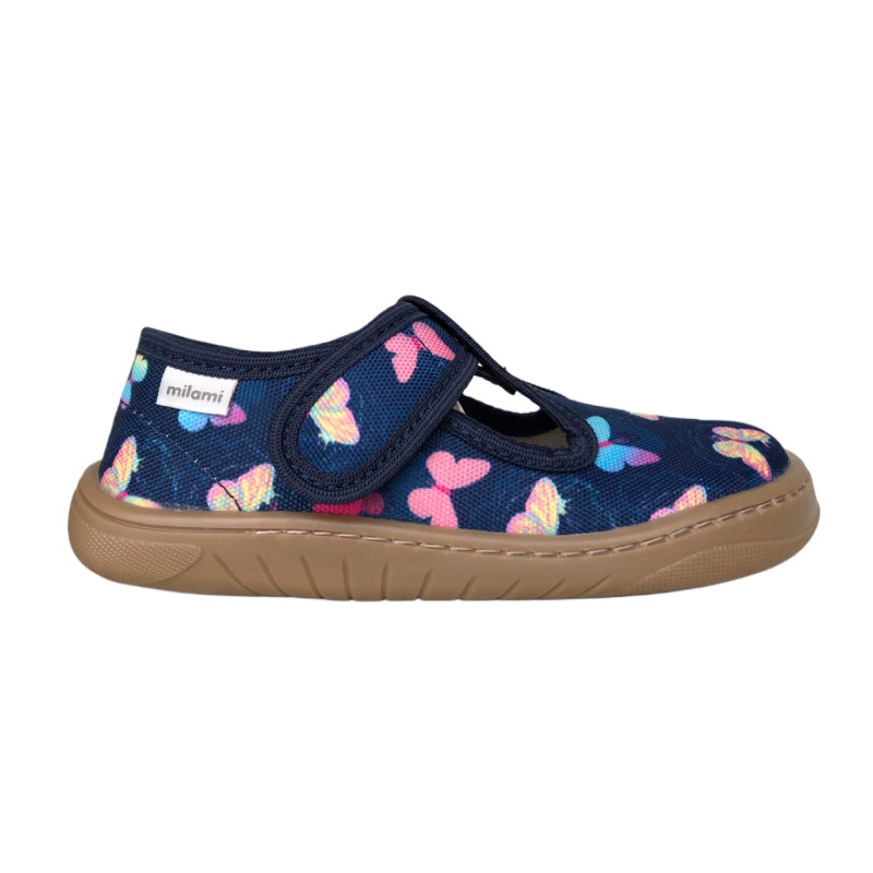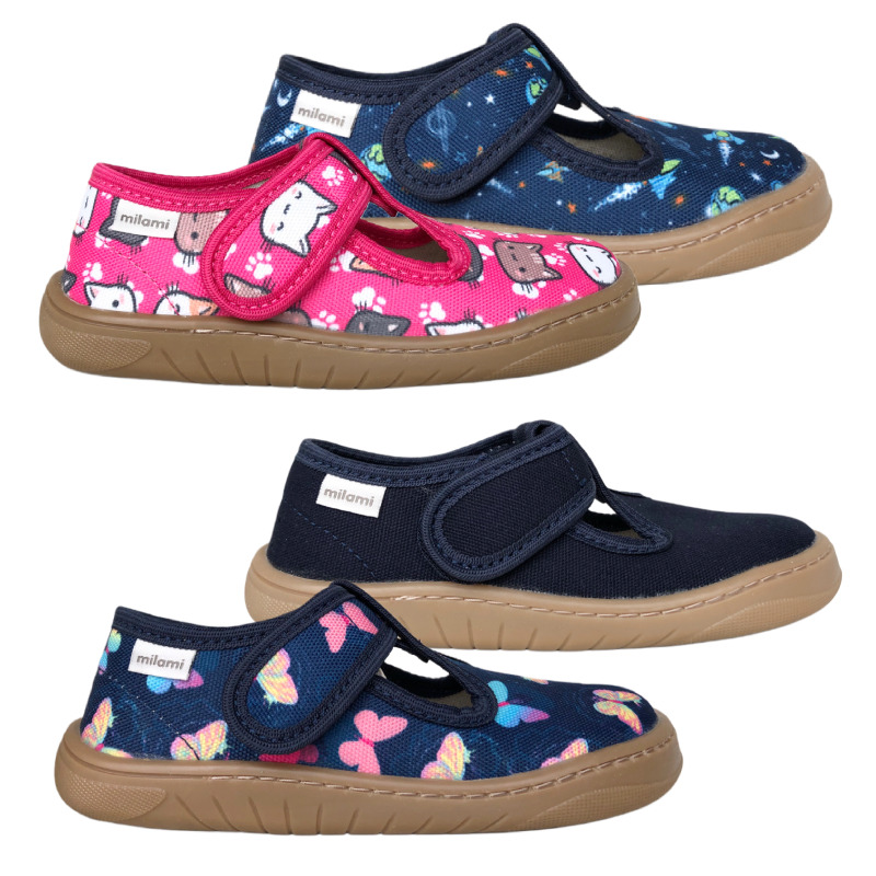 Dětské barefoot přezůvky BF1 jsou novinkou srbského výrobce Milami. Tvarově sedí na užší až normální nožku. Zapínají se na jeden suchý zip, jdou pěkně rozevřít a snadno se tedy budou nazouvat i malým dětem ve školce. Zvládnou také vyšší nárt. Jsou lehké a ohebné, špička je spíše kulatější, nejsou tedy vhodné pro nožky s dominantním palcem. Pěnová stélka s nášlapem z mikrovlákna zajistí pohodlí při chůzi. Ve spodní části opatku je pevná výztuha zamezující šmajdání, horní část je měkká. Textilní materiál a velká oka zajistí perfektní prodyšnost, takže se nožky Vašich ratolestí nebudou potit.